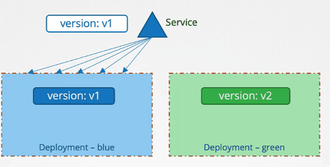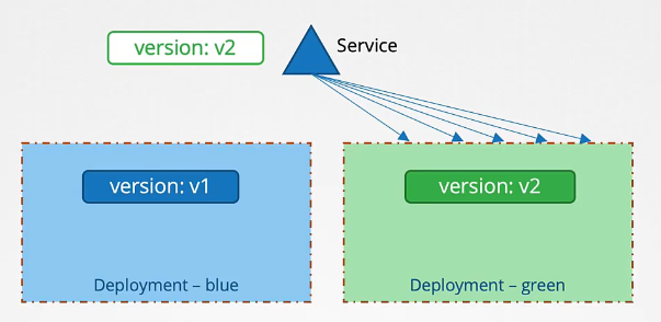 Once the green Deployment is tested and ready, traffic is re-routed to the new application version.