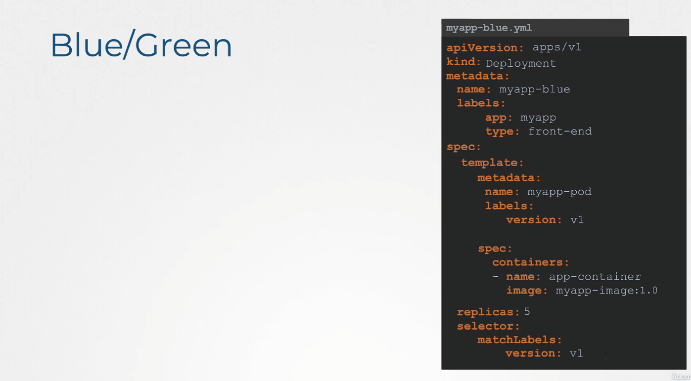 Rolling Update: Updates Pods one at a time to guarantee availability of the application. This is the preferred approach, and you can further tune its behavior