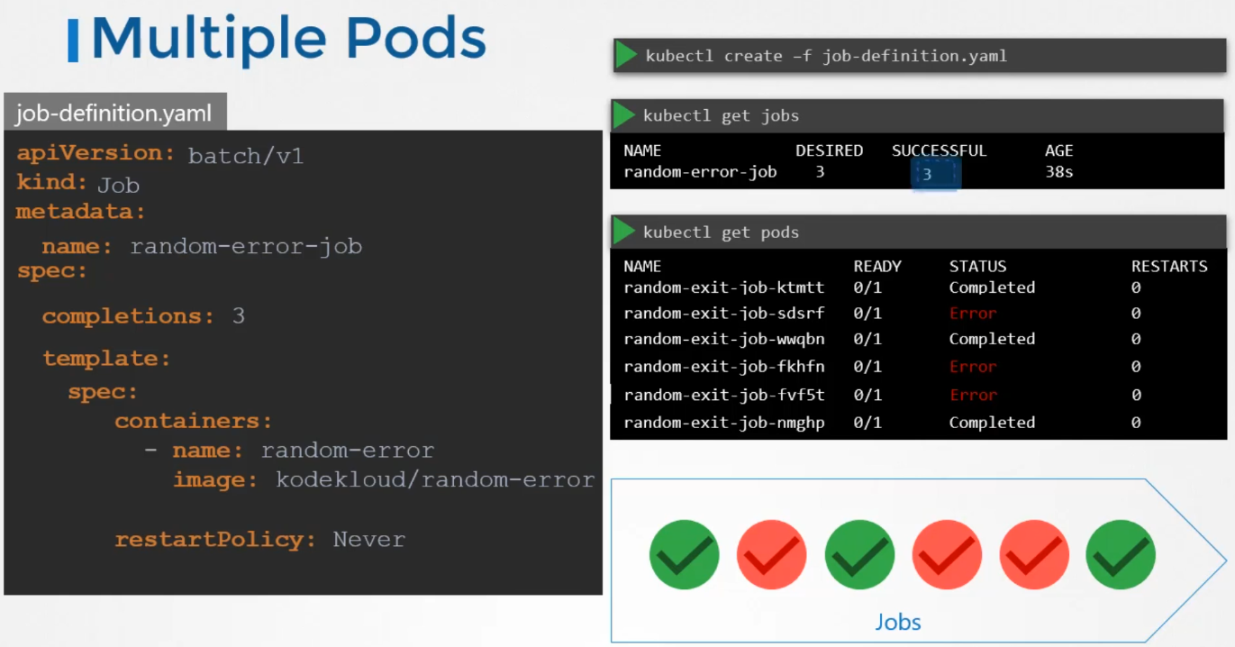 - The second pod fails, so Kubernetes creates a third pod.