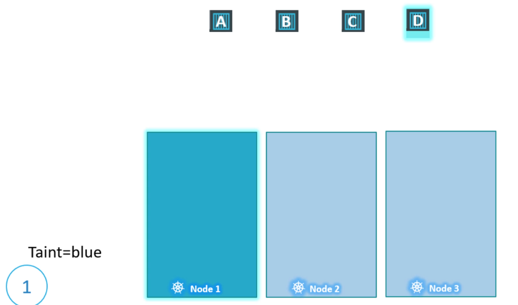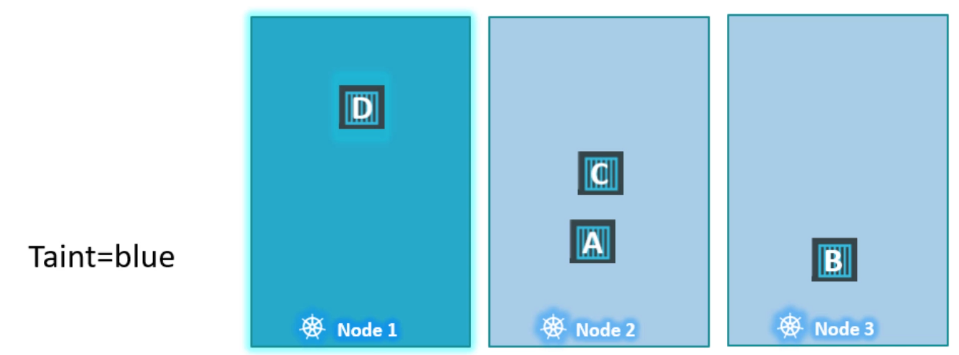 Next, we’ll allow pod D to run on node one by adding a toleration for the “blue” taint to that pod. Now, pod D can be scheduled on node one, while the other pods (A, B, and C) will be placed on nodes two and three. The scheduler attempts to place each pod, but pods without tolerations will be “thrown off” node one due to the taint.